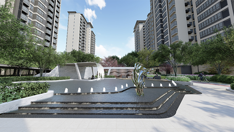 穿越山水景墻,來(lái)到溫潤(rùn)的陽(yáng)光鋪灑的草坪上,孩童的笑聲、老人的皺紋、愛(ài)人的親吻,無(wú)一不是現(xiàn)代雅致幸福的生活的象征。設(shè)計(jì)師讓人們于此中找到心歸處,之于生活,即是心靈世界的寄托,更是生活美學(xué)的折射。