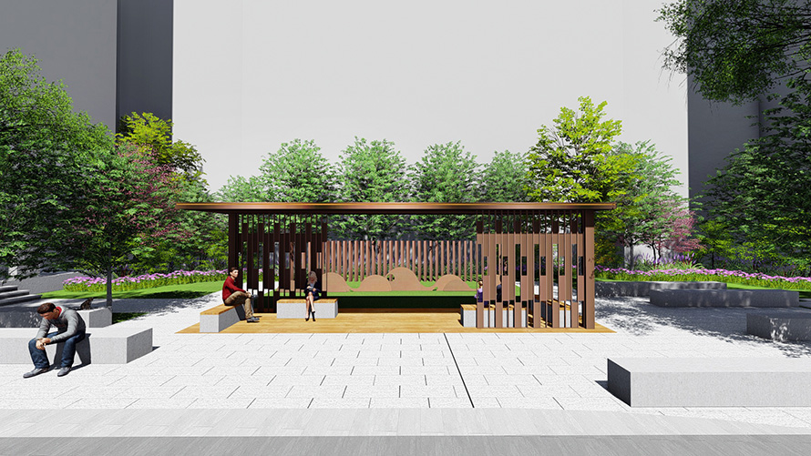 其中設(shè)置亭子,同樣與門樓相互照應(yīng)的風(fēng)格,采用自然的手法實(shí)現(xiàn)現(xiàn)代(地面)與古典(涼亭)的銜接,讓人產(chǎn)生穿越時(shí)空的錯(cuò)覺(jué),獨(dú)具書(shū)院氣質(zhì)。