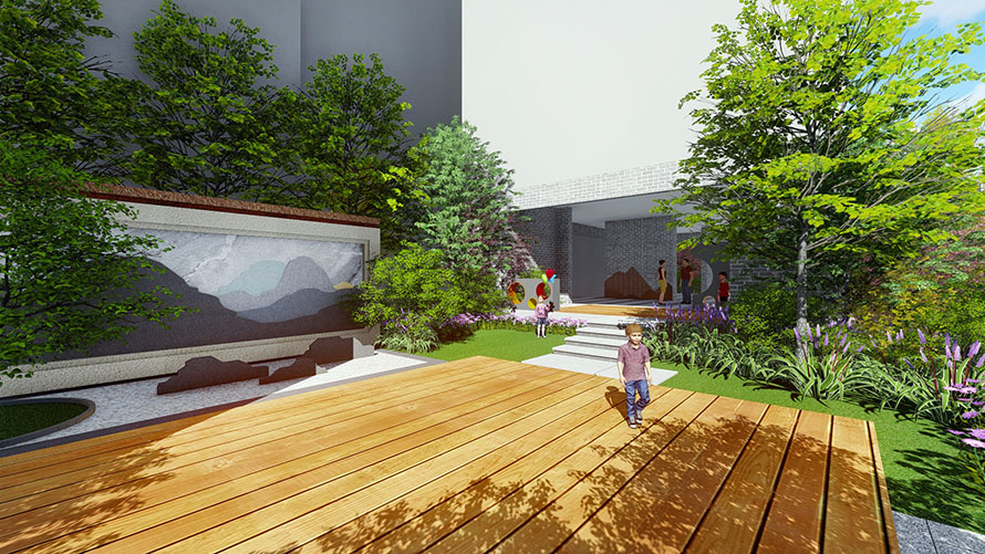 “堂”空間作為還原未來(lái)生活場(chǎng)景的場(chǎng)所,我們希望它是更加自由和開(kāi)放的,形成人與空間能實(shí)現(xiàn)功能性的運(yùn)用,實(shí)現(xiàn)流通、停留的作用,突出“以和為貴”的人性設(shè)計(jì)。居所當(dāng)“以人為本”為設(shè)計(jì)的本源。借助建筑空間的對(duì)稱感,將景墻延伸穿插,形成高低層次的遞進(jìn)空間。