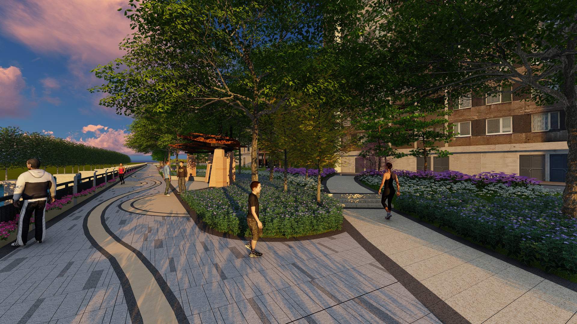 通過以群落式的復(fù)合型綠化等多種綠化組團搭配,進行適當?shù)目臻g塑造,形成層次豐富的植物景觀,局部點綴花境類植物。景觀構(gòu)成元素:水、植物。