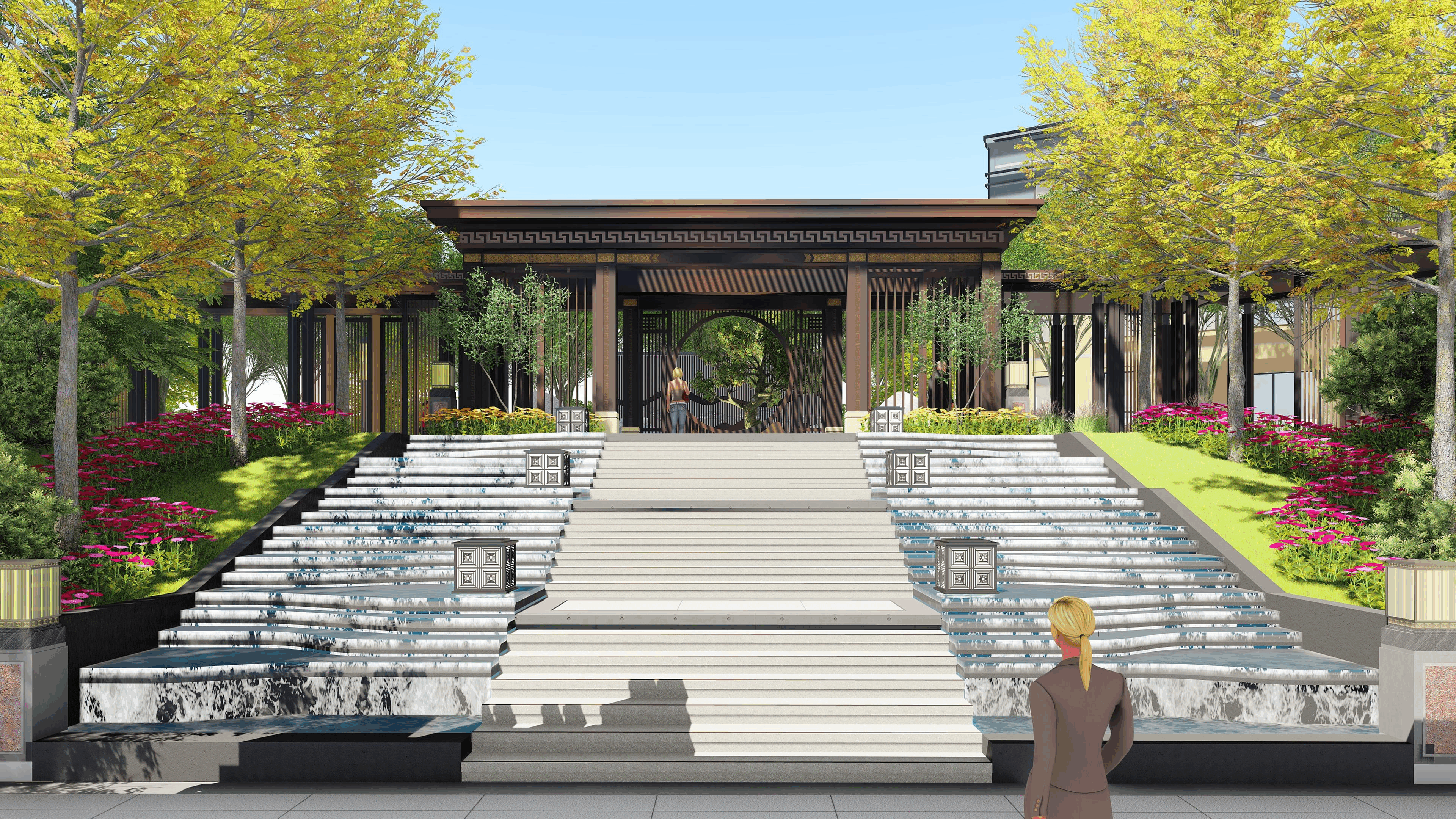 新中式景觀契合場地背山面水的特征,做差異化的景觀,展現(xiàn)精致的東方美學(xué)與經(jīng)典西方美學(xué), 傳統(tǒng)元素與現(xiàn)代手法相融合的“文化馨品”。